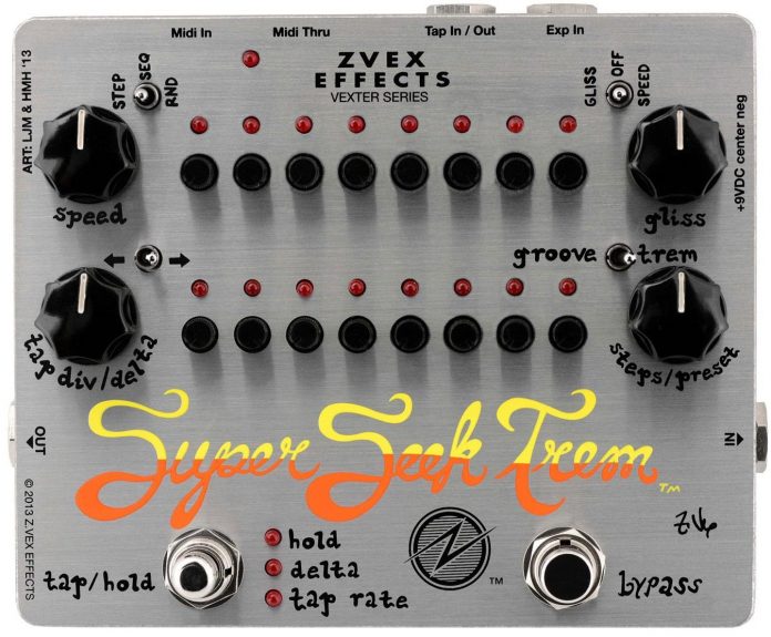 The ZVex Super Seek Trem allows the user to create unusual rhythmic patterns, MIDI sync, tap tempo, and provides expression control over speed and glissandos (as well as many other things).