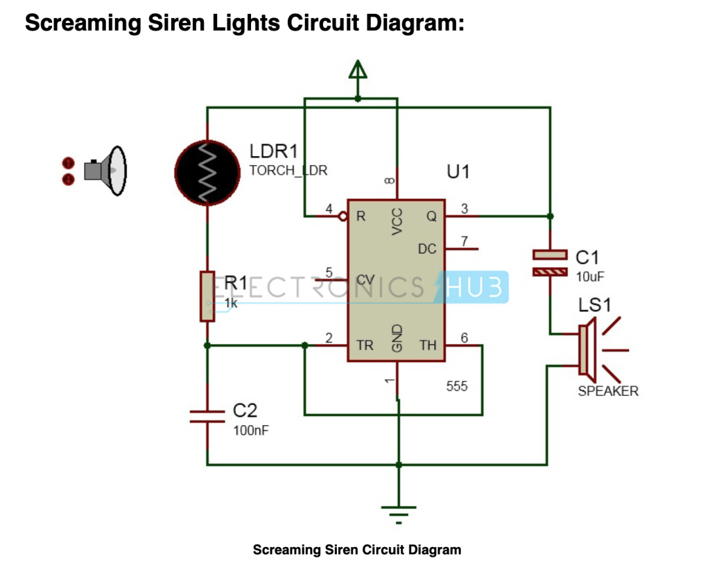 2. Another example of a project that uses the 555 timer is the Screaming Siren Lights Circuit (https://www.electronicshub.org/screaming-siren-circuit/).